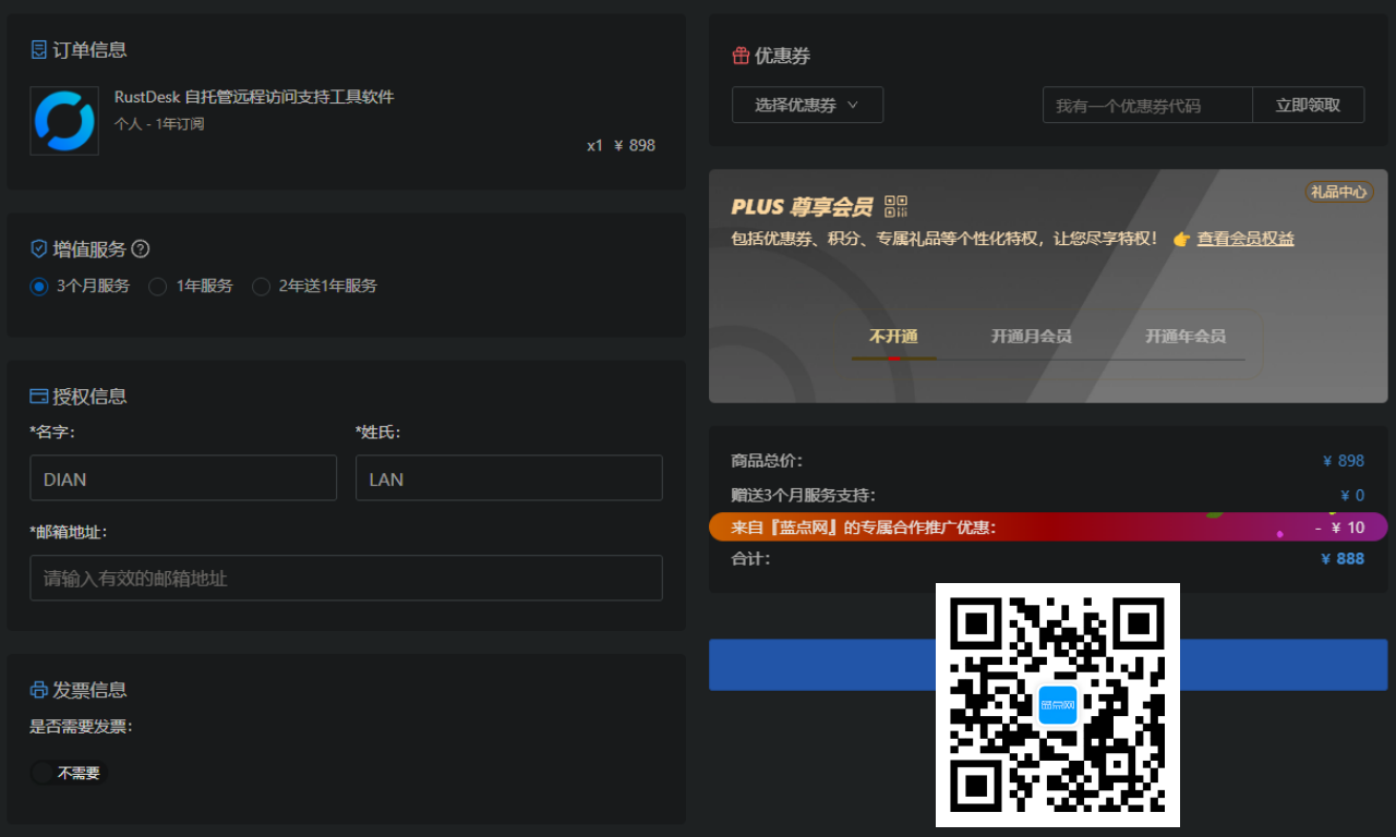 RustDesk个人版订阅1年:5L科技券后价888元,支持开具对公发票 (包括专票),由RustDesk官方团队提供技术支持。