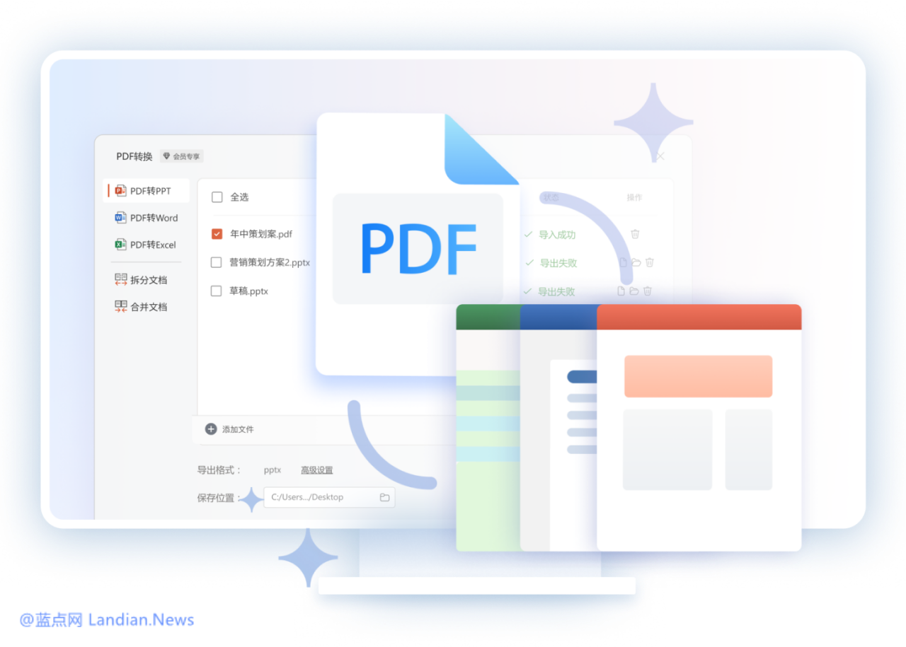内置PDF转换工具箱:可将PDF文件转换为Word、Excel、PowerPoint进行编辑,支持批量转换、PDF文档拆分合并。