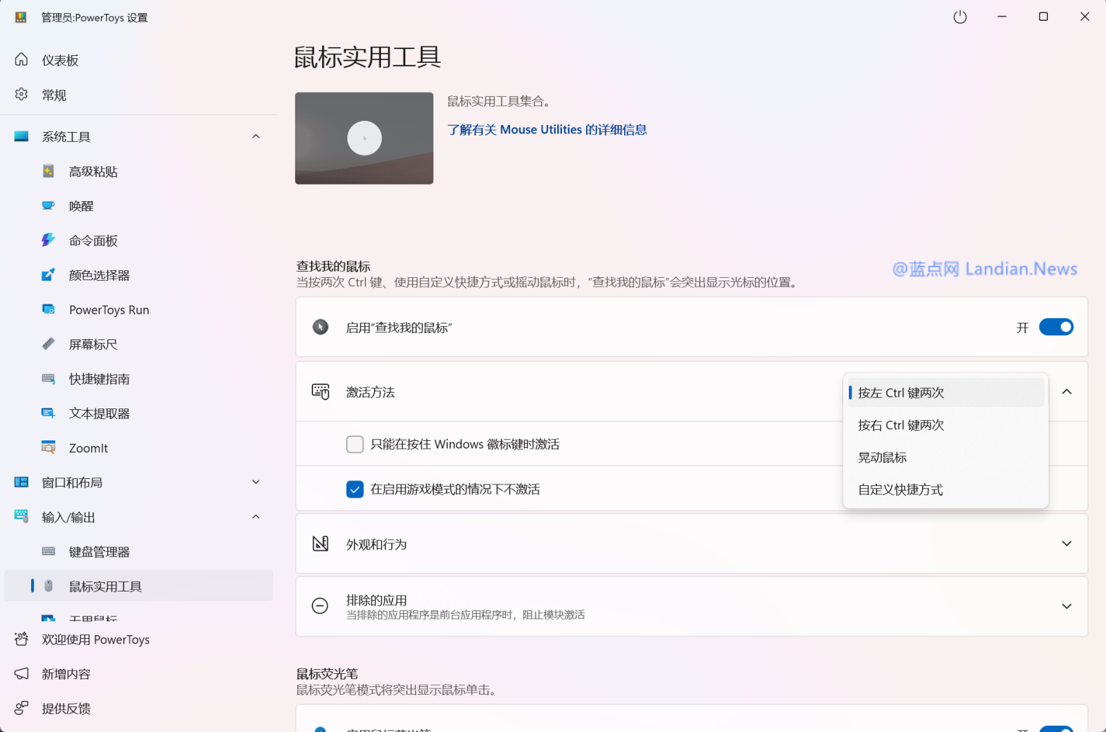 开启方法如下:安装 PowerToys 后转到输入 / 输出、鼠标实用工具、启用查找我的鼠标,默认情况下为按两次左侧的 Ctrl 键显示鼠标指针,PowerToys 里的新样式是图层 + 圆圈,如下图: