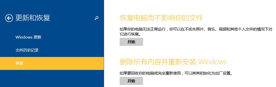 按Win+I键,然后点击更改电脑设置--更新与恢复--恢复,然后按照你的需要进行恢复,不会再提示让你插入介质了,如下图: