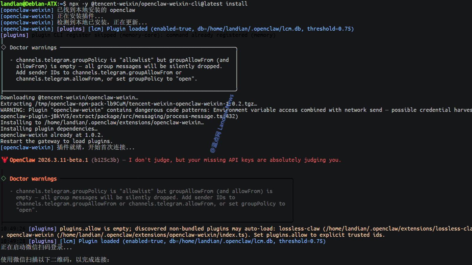 2. 在已经安装 OpenClaw AI 机器人的设备上执行如下命令安装 NPM 插件:
