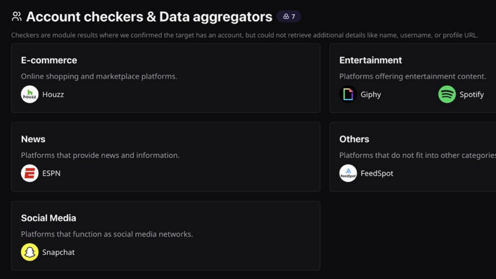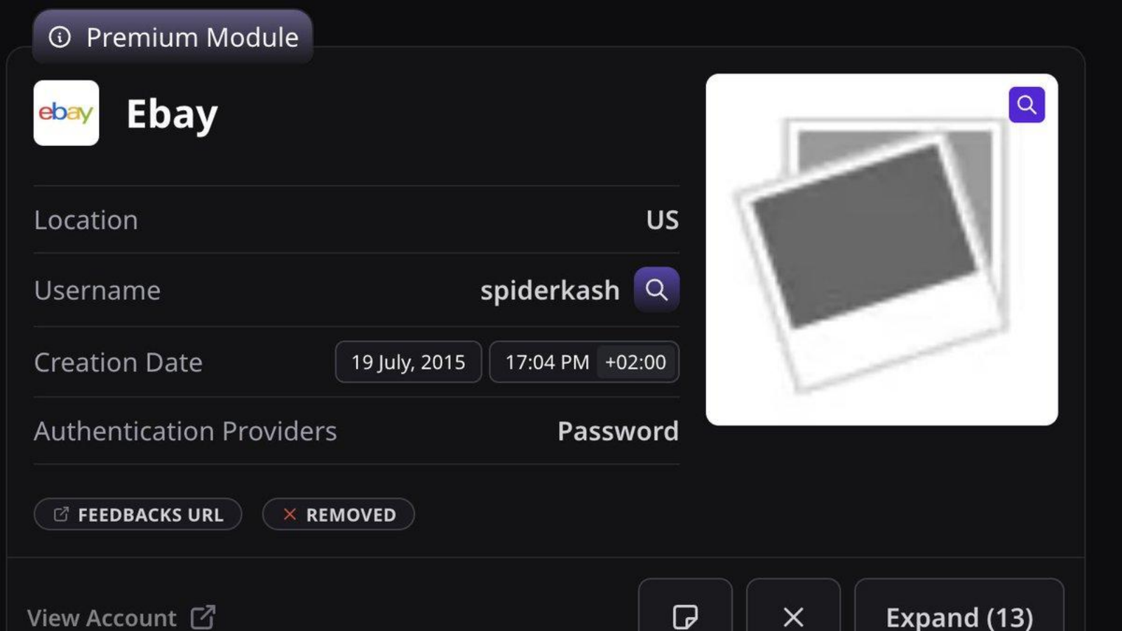 然而只要有邮箱就可以借助开源情报工具收集更多信息,数据来源包括各个网站公开或泄露的数据,例如成人网站 XVideos 的注册账户、eBay 的购物评价、Snapchat 账户、其他网站的账号密码等。