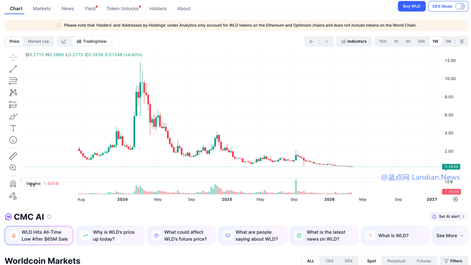 萨姆奥尔特曼的世界基金会日前通过场外交易已经成功出售价值 6,500 万美元的 WLD 代币,而现在 WLD 代币也已经跌至历史新低,该代币较高峰期时已经跌掉 97%。