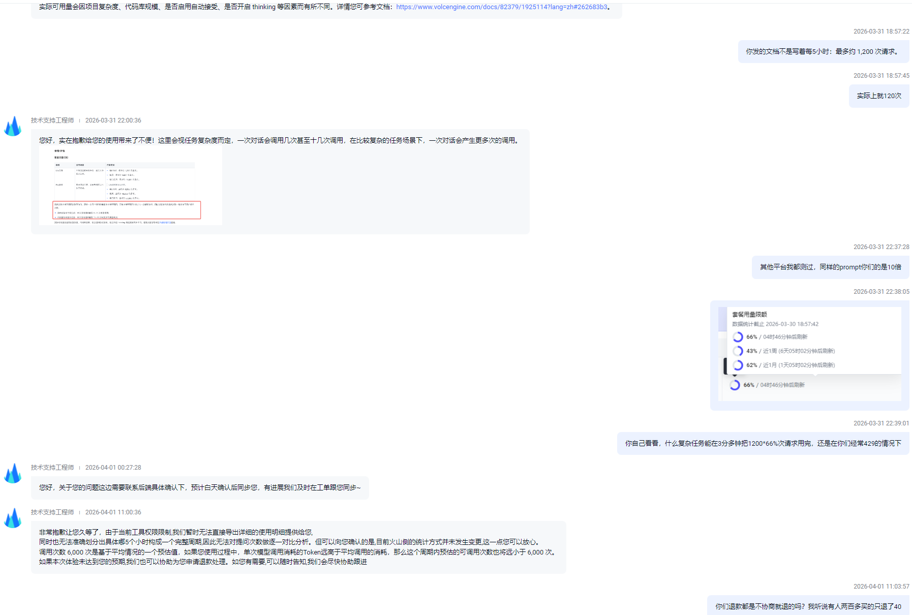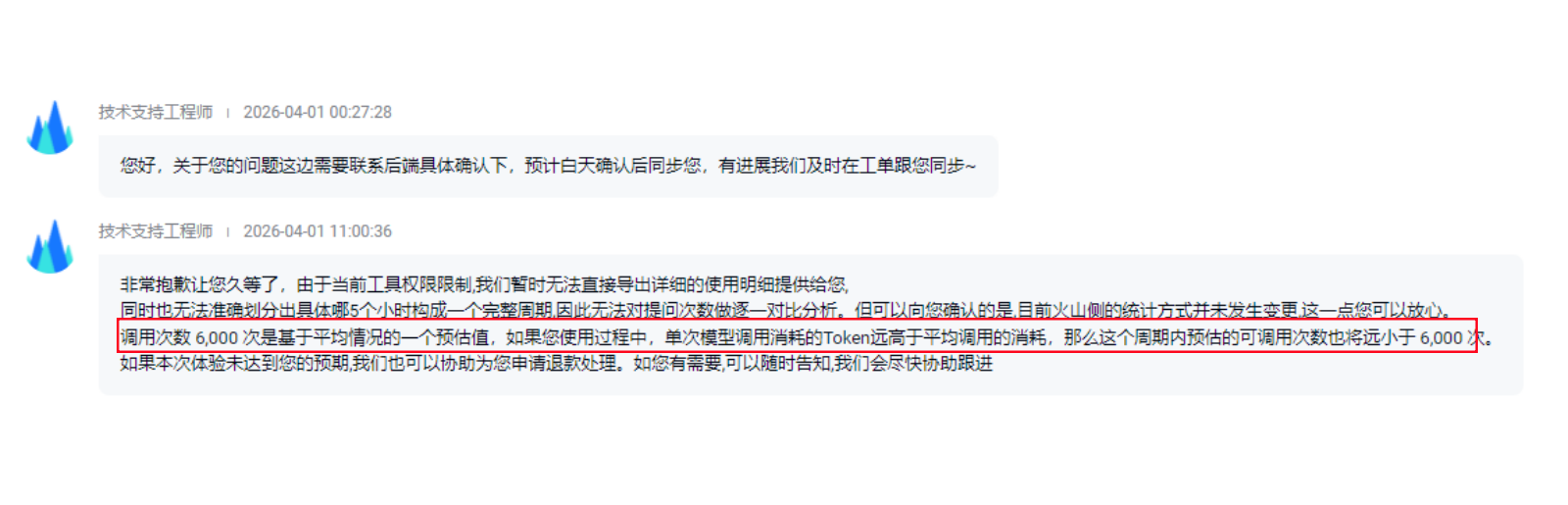 有网友发现自己使用火山引擎的 Coding Plan 消耗速度要比其他平台更快,于是联系客服对线并且得到让人摸不着头脑的答复:在使用过程中单次模型调用消耗的 Tokens 若远高于平均调用的消耗,则周期内预估的可调用次数也会远小于 6,000 次。