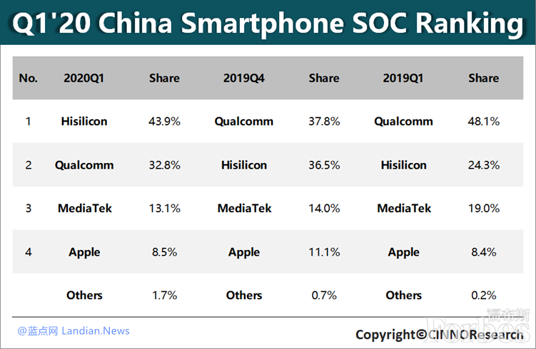 CINNO:2020年第一季度华为海思智能手机处理器在华出货量超过高通