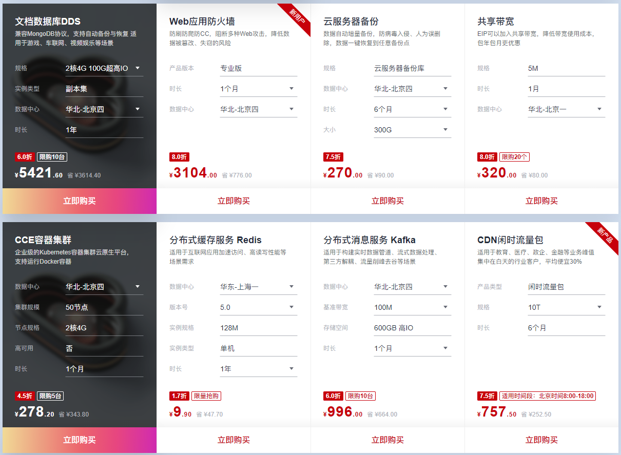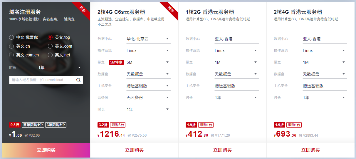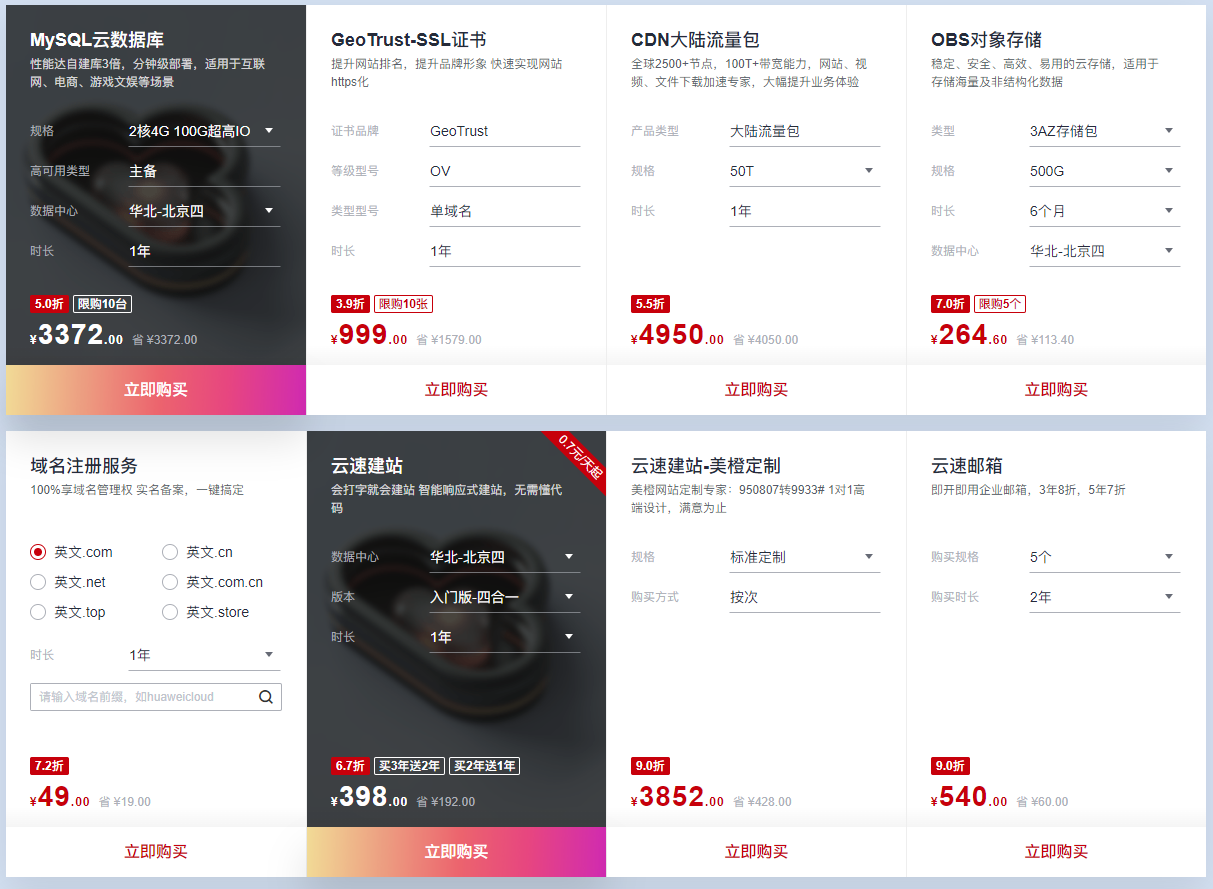 本次华为云年中大促还准备域名注册服务、云数据库服务、内容分发网络、对象存储、海外服务器以及快速建站。