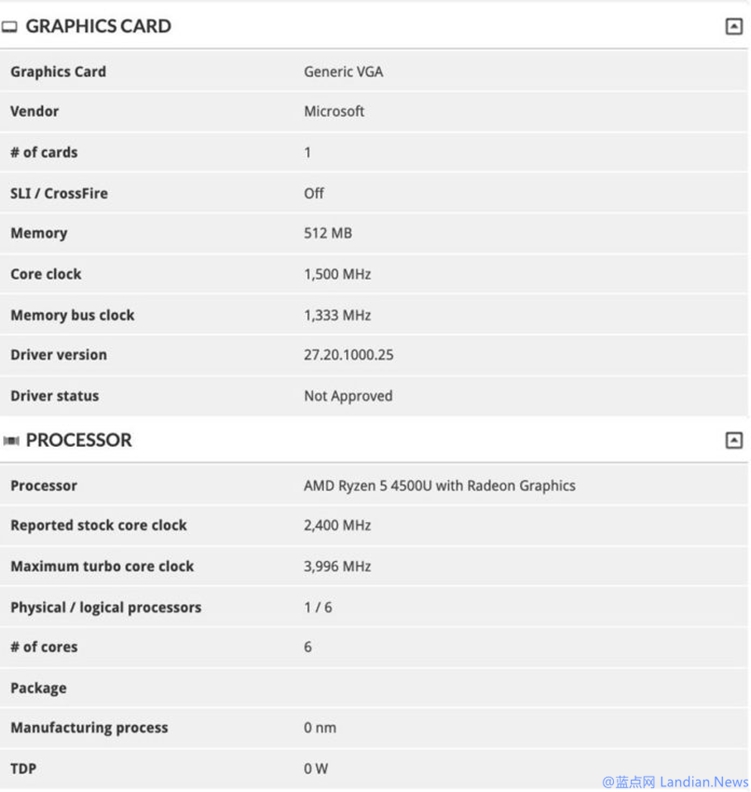 估计 Surface Laptop 4可能会和 Surface Laptop 3的配置选择差不多,也就是都会提供 AMD 处理器的版本选择。目前已经有搭载 AMD 处理器的 Surface Laptop 4 跑分数据曝光了,根据数据图了解,Surface Laptop 4会搭载 AMD Ryzen 4500处理器,配备 AMD Radeon RX 5300M 显卡,该处理器的默频为2.3GHz,睿频为4GHz,采用 AMD Zen2结构。