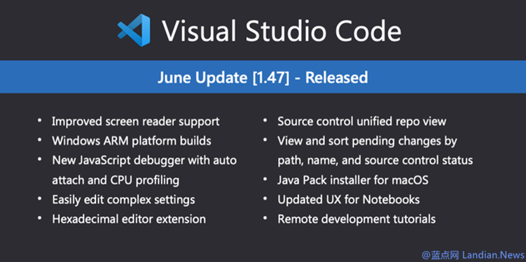 Visual Studio Code 的社交媒体账号今天公布了此次更新的全部内容,其中包括辅助功能改进(屏幕阅读器功能获得更新)、支持运行 Windows 10的 ARM 设备、全新的 JavaScript 调试器、统一源代码视图、全新查看文件的方式(树或者列表)、可以在 IDE 中编辑对象设置、全新的 HexEditor 文件扩展名、全新的笔记本 UI、远程开发教程(通过 SSH 进行远程开发)和支持在 macOS 平台上进行 Java 开发。