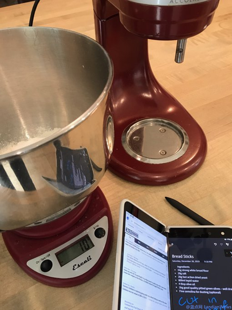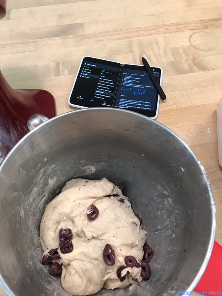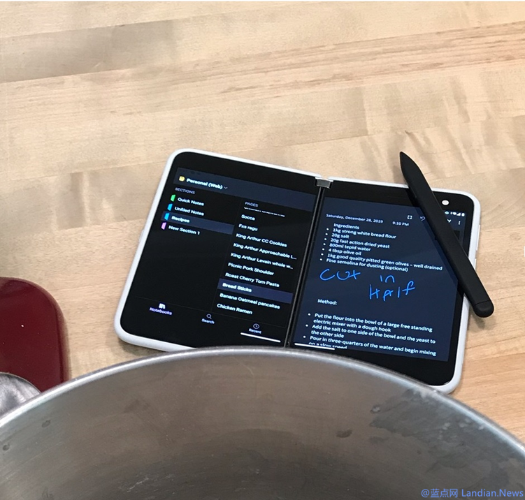 照片中的 Surface Duo 左边屏幕是 OneNote 的所有笔记本页面,右侧是这位高管正在制作的糕点的食谱,Surface Duo 的应用显示逻辑和传统的平板电脑类似,都是左边显示上一级,下一级页面会在屏幕右边显示。