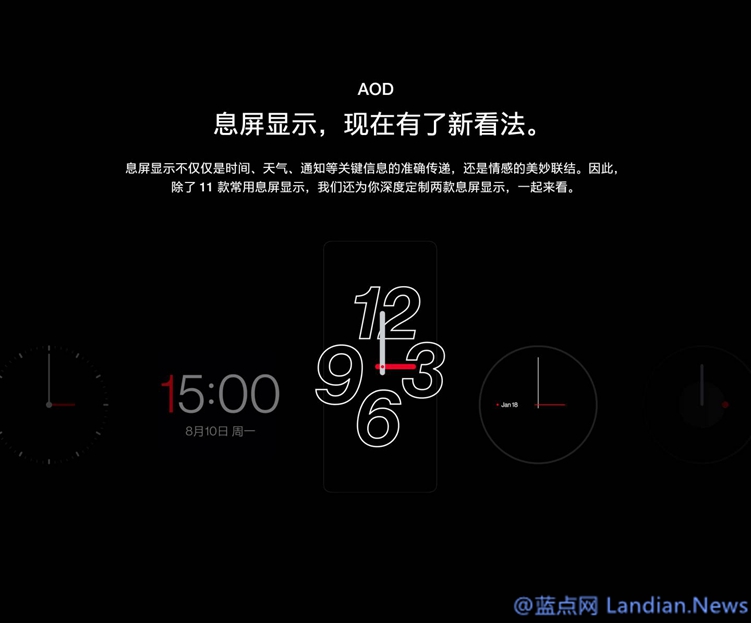 一加与国外一所设计学院的学生联手打造了 AOD 息屏常显功能,提供了11种不同风格的显示模式。