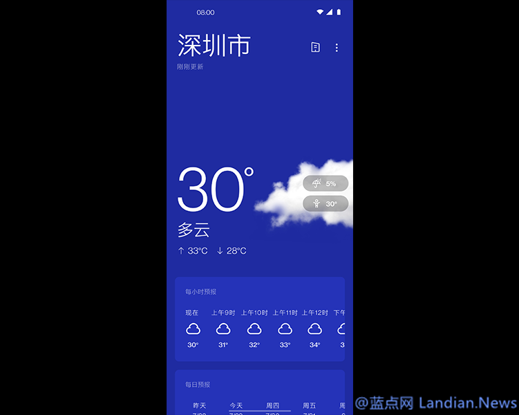 系统的第一款应用“天气”也迎来了重大的升级,不过此风格目前争议颇大,首当其中的便是“天气”应用的字体大小比例奇怪。