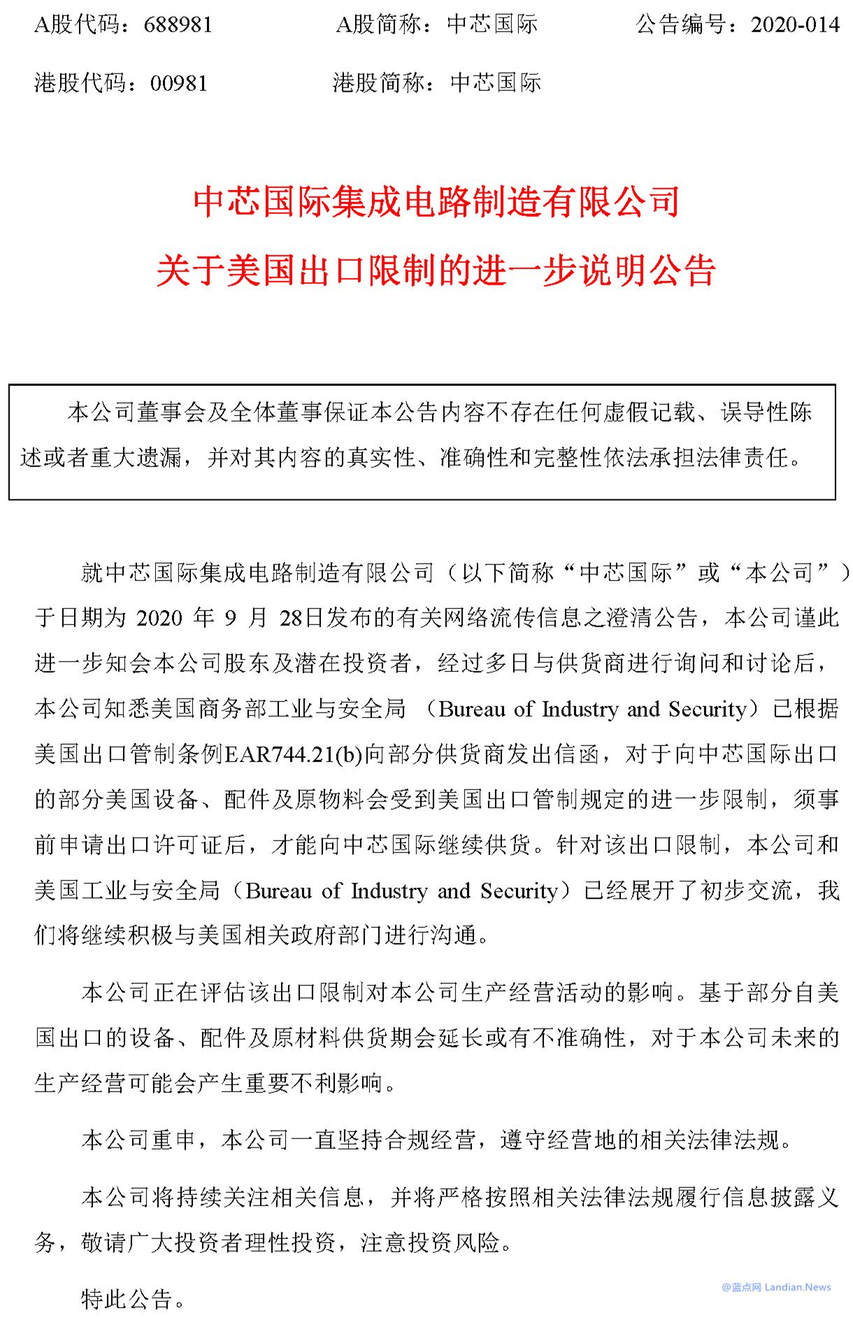 中芯国际发布新公告称正在评估出口限制影响 可能会产生重要不利影响