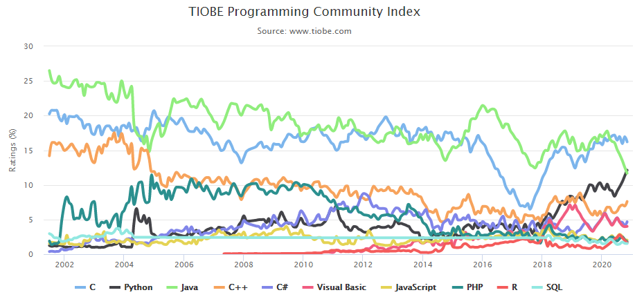 专门用来统计各类编程语言受欢迎程度的TIOBE指数目前已经更新202011月版,在此次更新中TIOBE使用的标题是Python势不可挡。