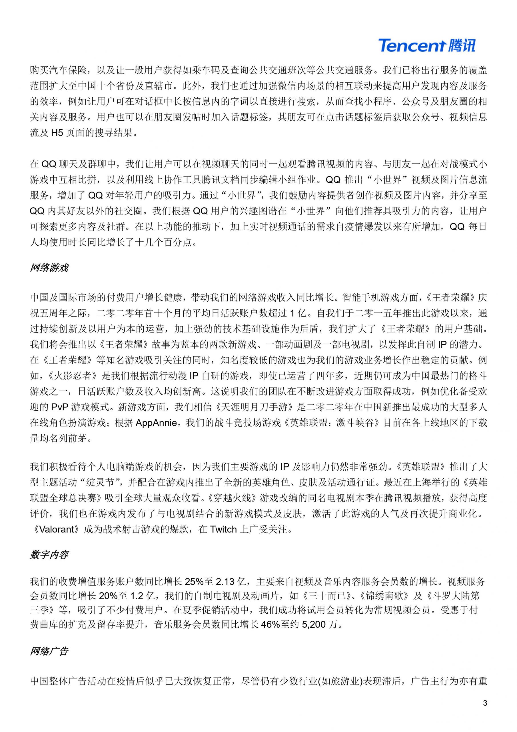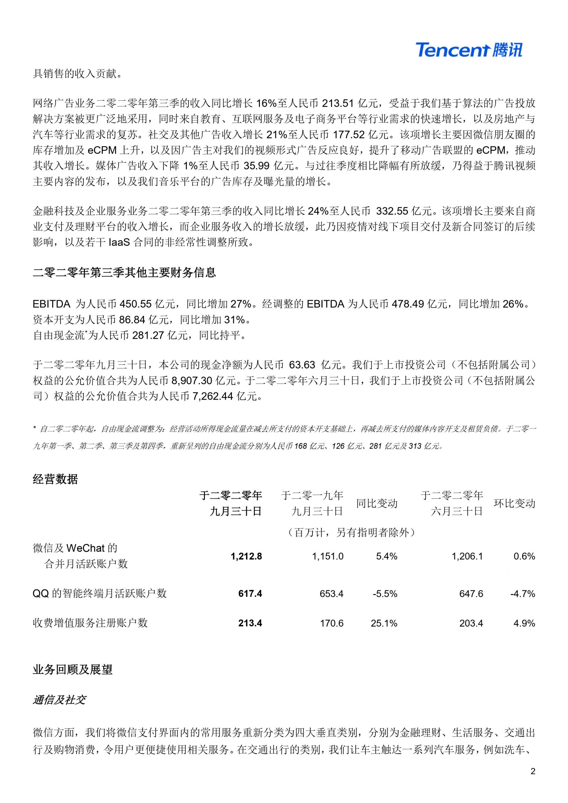 当季度微信与WeChat用户合并月活跃账户数达到12.1亿同比增长5.4%、腾讯QQ月活用户6.17亿同比减少5.5%。