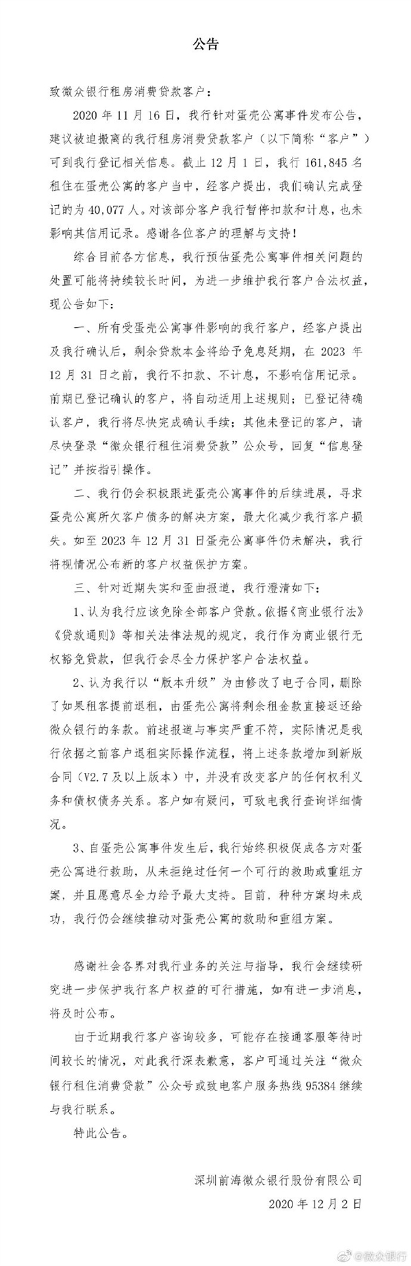 受蛋壳公寓事件影响目前腾讯旗下微众银行已经公布多个临时方案,包括暂停向欠款用户催收贷款和上报征信等。