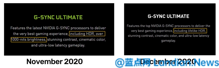 有网友查证英伟达官网信息后确认,英伟达已经悄悄修改了 G-Sync Ultimate 的认证标准,新的标准不再要求显示器具备 HDR 1000,仅需能够呈现“逼真的 HDR 效果”即可。