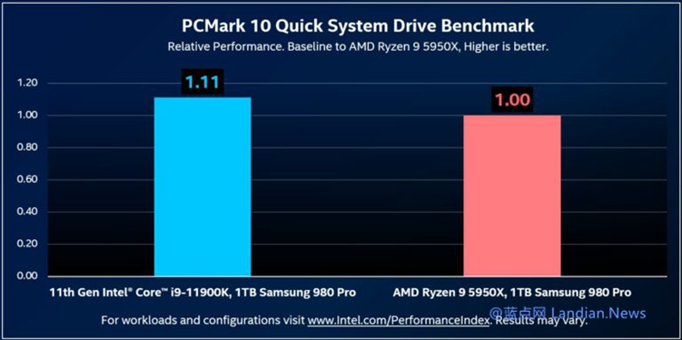 最近,英特尔首席性能战略家 Ryan Shrout 和存储技术分析 Allyn Malventano 声称,即将推出的 Rocket Lake-S 架构 i9-11900K 处理器在 PC Mark 11的存储环节中得分比 AMD Zen 3架构 Ryzen 9 5950X更高,约有11%的提升。
