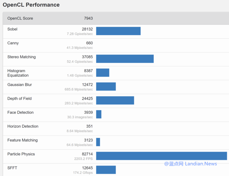 显卡的 OpenCL 测试结果惨不忍睹,比英伟达几年前发布的 GeForce 500系列显卡还要差劲,不过也有可能是跑分的电脑并没有安装上这块显卡的驱动。