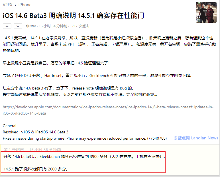 这名网友在升级iOS 14.6 Beta版后重新进行基准测试,现在分数恢复到3900多分进行各种游戏也不再出现卡顿。