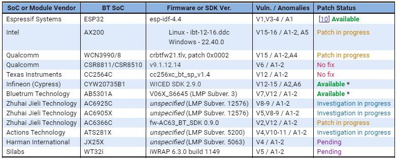 研究发现包括来自英特尔、高通、德州仪器、珠海杰理科技、蓝汛科技、炬芯科技、乐鑫科技、哈曼国际以及芯科实验室的蓝牙芯片均受漏洞影响,这些公司生产的蓝牙芯片被广泛用于台式机、笔记本电脑、智能手机、物联网设备、信息娱乐系统、音频设备(耳机、蓝牙音箱)、键盘和鼠标、玩具以及工业控制设备(如PLC)。
