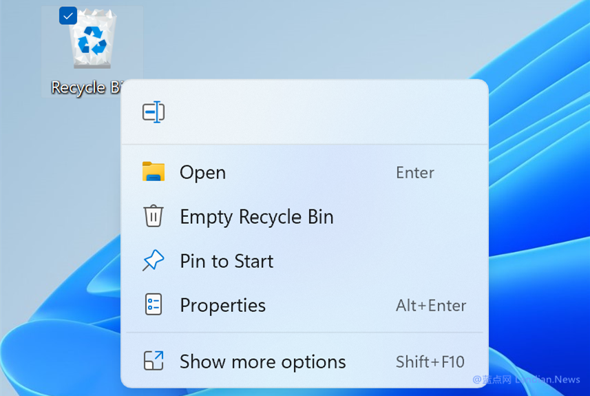 1.现在桌面右键菜单里新增清空回收站的现代选项,当用户升级此版本并右键点击回收站时即可看到这个新图标。