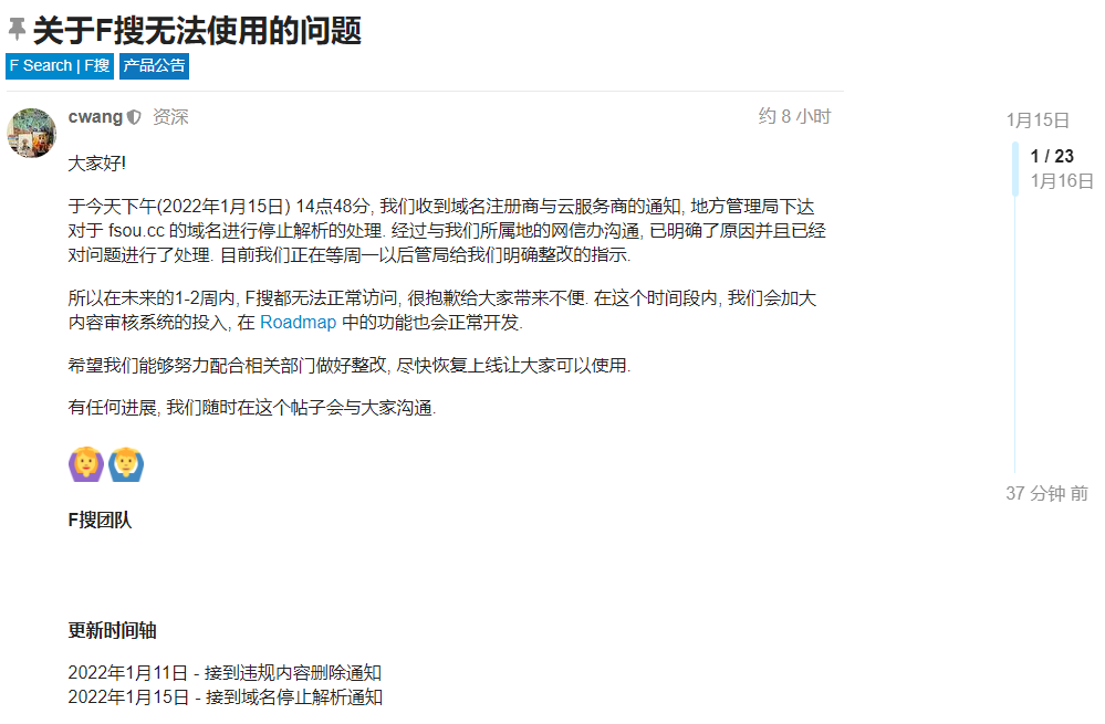 于今天下午(2022年1月15日) 14点48分,我们收到域名注册商与云服务商的通知,地方管理局下达对于 fsou.cc 的域名进行停止解析的处理。经过与我们所属地的网信办沟通,已明确了原因并且已经对问题进行了处理。目前我们正在等周一以后管局给我们明确整改的指示。