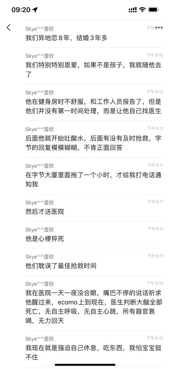 前天(2月21日)在健身房觉得身体不舒服向工作人员报告,但工作人员没有第一时间处理而是让吴伟自己找医生,后面开始吐酸水。滢欣质疑字节跳动没有及时抢救,回复模糊不肯正面回答。在公司拖了一个小时才通知家属并送医。