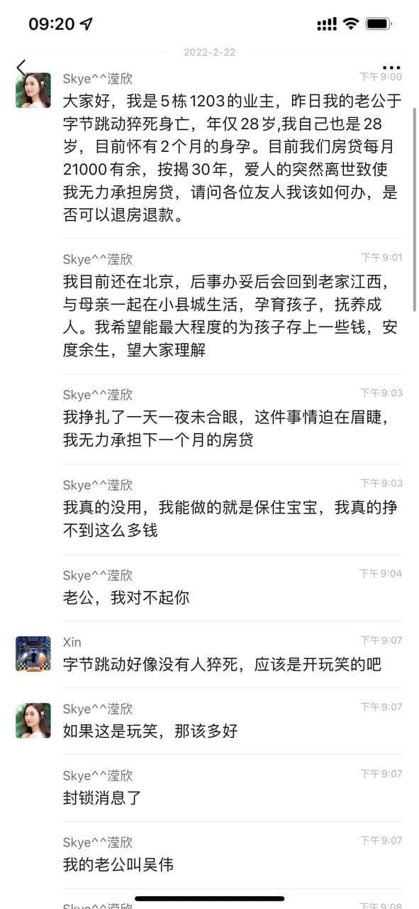 这名图像算法工程师年仅28岁,与滢欣异地恋8年、结婚3年多,目前滢欣怀孕仅两月还没有过稳定期。更艰难的是目前夫妻俩背负30年的房贷,每个月还款金额21000元,吴伟去世后滢欣无力负担房贷所以在业主群里咨询邻居是否可以退房退款。从聊天记录来看吴伟还有一位老母亲,滢欣准备在后事办妥后回到老家江西孕育孩子。