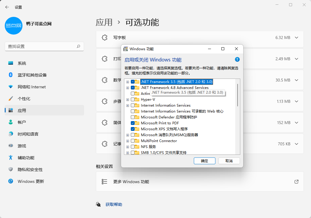 框架程序启用位置位于设置、应用、可选功能、更多 Windows 功能,找到 .NET Framework 3.5 框架程序。