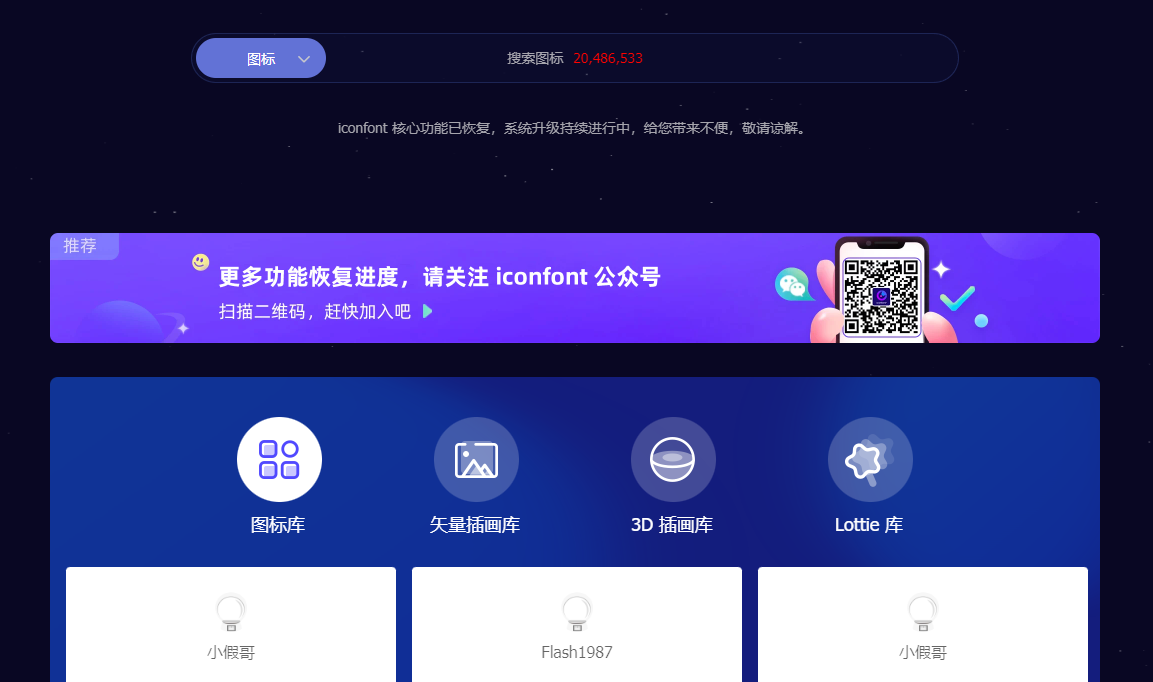 已经恢复使用的仅图标库,其他库如矢量插图库、3D插图库、Lottie库无法使用,图标搜索功能目前也能用。
