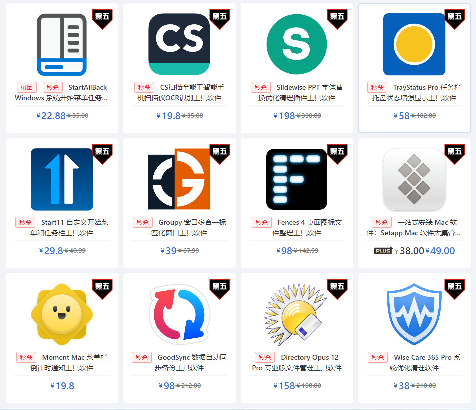 StartAllBack 任务栏美化和增强工具、CS 扫描全能王、Slidewise PPT 字体替换优化清理插件、TrayStatus Pro 任务栏托盘状态增强显示工具、Start11 自定义开始菜单和任务栏、Groupy 窗口多合一管理工具、Fences 4 桌面图标文件整理工具、GoodSync 数据同步备份工具、Directory Opus 12 Pro、Wise Care 365 Pro 系统清理优化工具、
