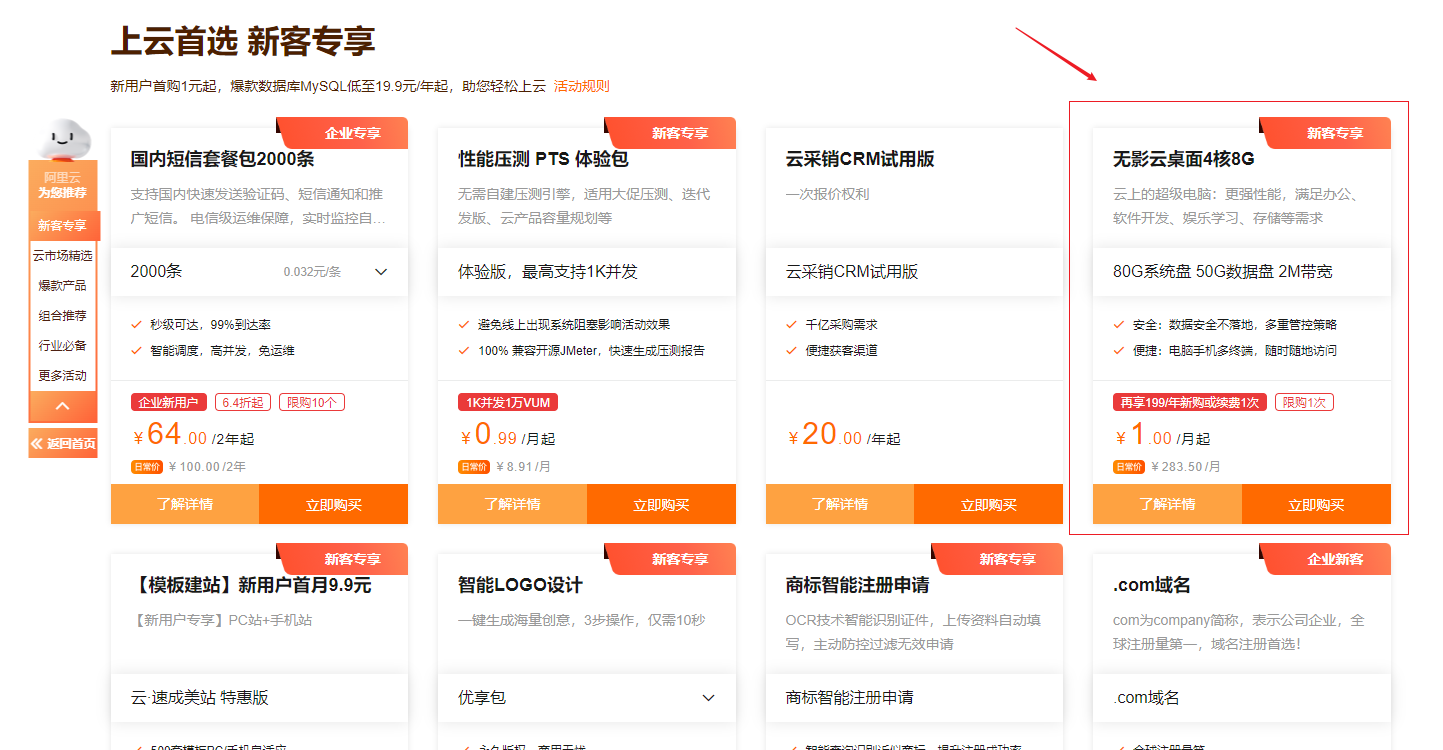 开通地址:https://ourl.co/alieds 在页面中间选择无影云桌面4核8G版下单即可,原价284元现价仅需1元。